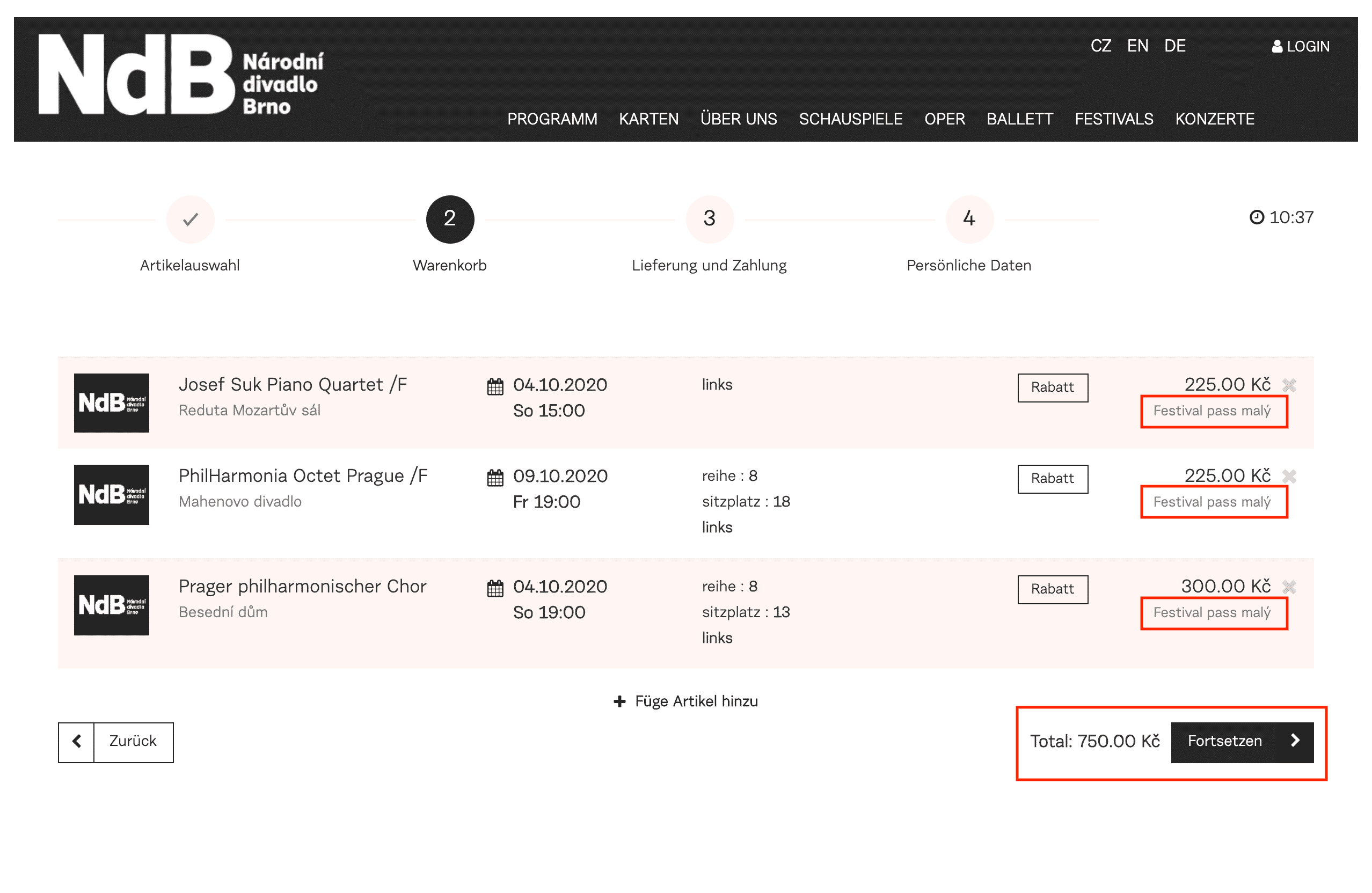 To add another performance from the festival, use the original window with the offer of the Janáček festival website (janacek-brno.cz), where you can select the next performance and click on “Buy tickets”.